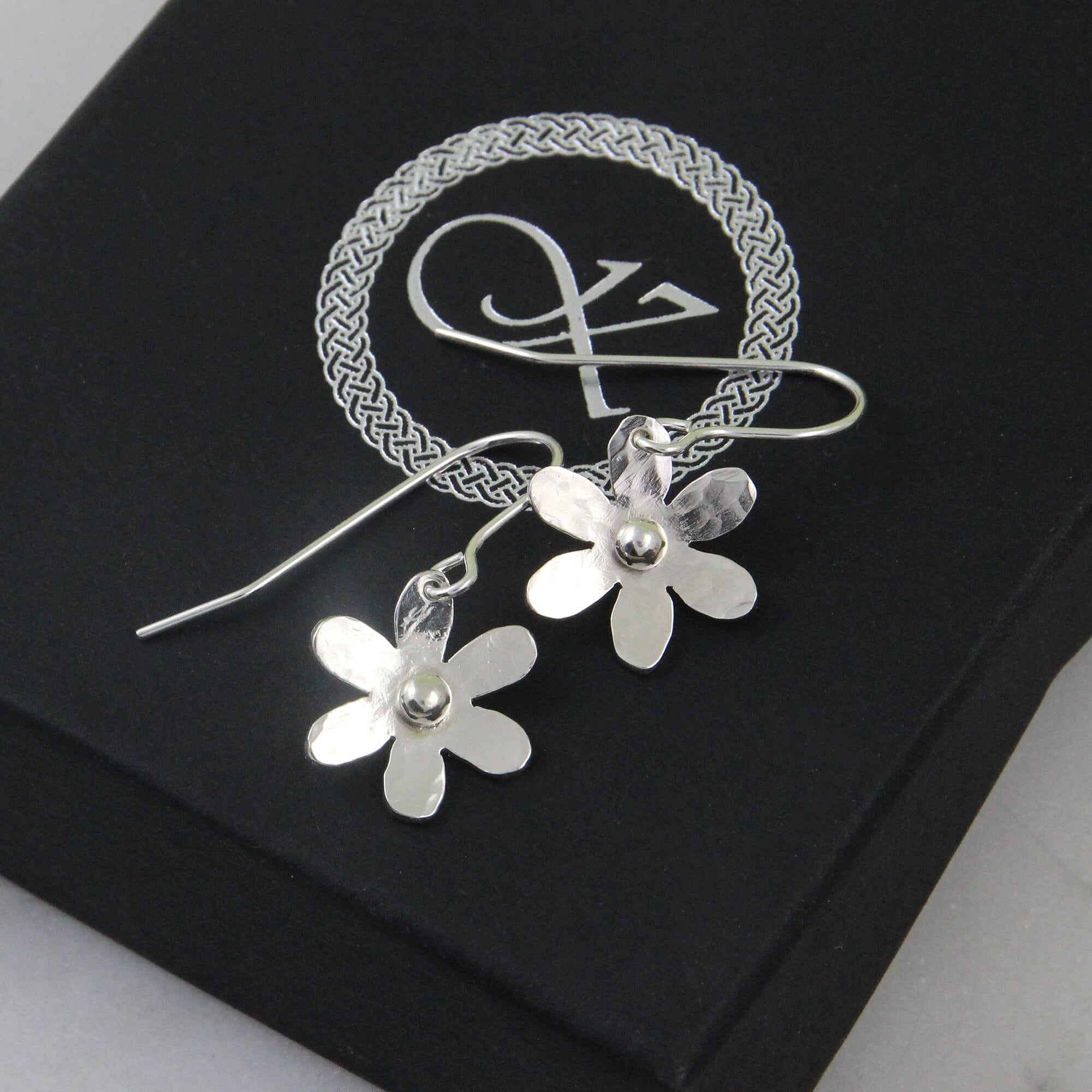 Daisy ørepynt formet som en blomst med hamret overflate.