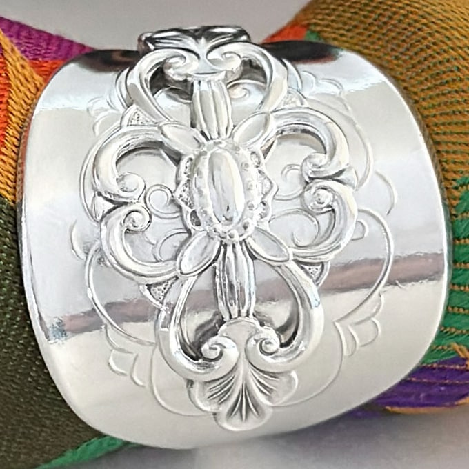 Skjerfringen passer til silkeskjerf til bunad, men også til andre tynne skjerf. Den kan brukes både til hverdag og fest, og gir et rolig og gjennomført uttrykk. Denne ringen har levd et liv før den ble formet på nytt. Bestikket er bearbeidet for hånd og gitt en ny funksjon. Den bærer med seg et streif av nostalgi, minner om generasjoner før oss og gir silkeskjerfet et vakkert feste uten nåler som lager hull i stoffet.