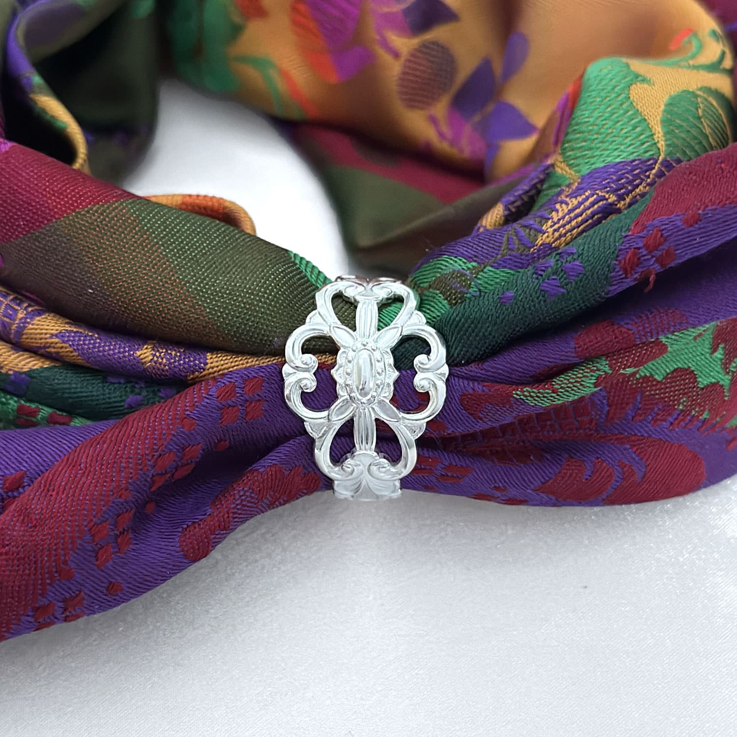 Skjerfringen passer til silkeskjerf til bunad, men også til andre tynne skjerf. Den kan brukes både til hverdag og fest, og gir et rolig og gjennomført uttrykk. Denne ringen har levd et liv før den ble formet på nytt. Bestikket er bearbeidet for hånd og gitt en ny funksjon. Den bærer med seg et streif av nostalgi, minner om generasjoner før oss og gir silkeskjerfet et vakkert feste uten nåler som lager hull i stoffet.