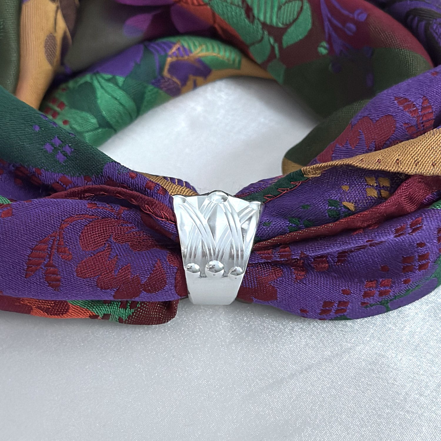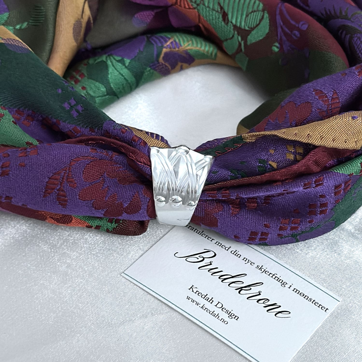 Skjerfringen passer til silkeskjerf til bunad, men også til andre tynne skjerf. Den kan brukes både til hverdag og fest, og gir et rolig og gjennomført uttrykk. Denne ringen har levd et liv før den ble formet på nytt. Bestikket er bearbeidet for hånd og gitt en ny funksjon. Den bærer med seg et streif av nostalgi, minner om generasjoner før oss og gir silkeskjerfet et vakkert feste uten nåler som lager hull i stoffet.