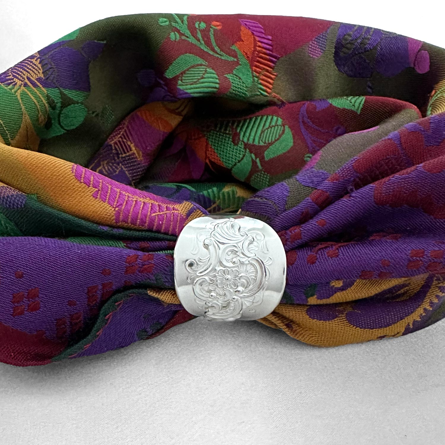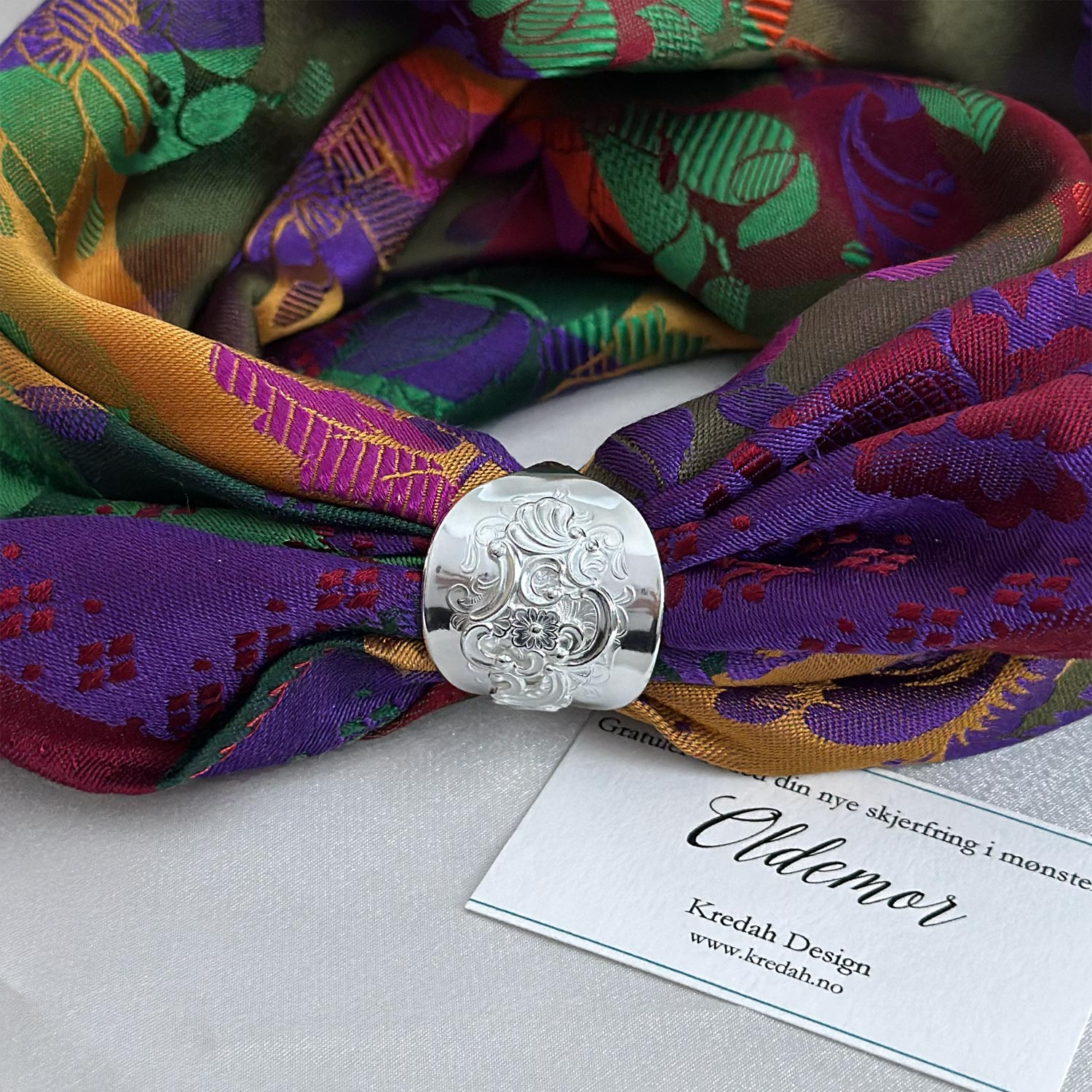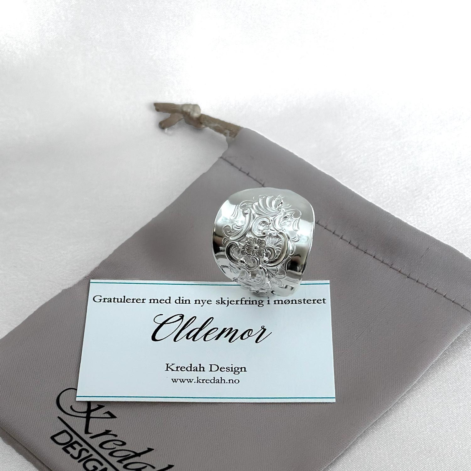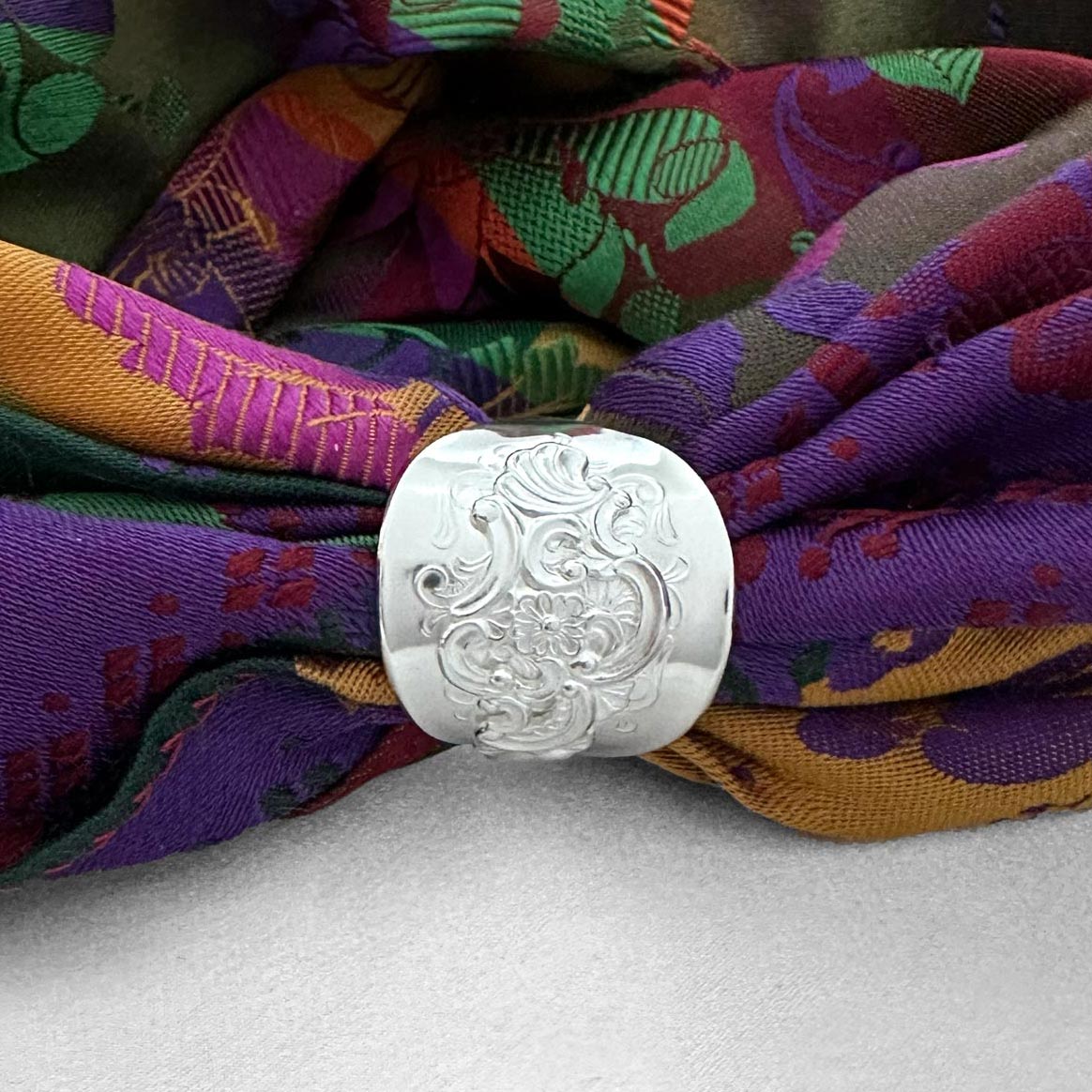 Skjerfringen passer til silkeskjerf til bunad, men også til andre tynne skjerf. Den kan brukes både til hverdag og fest, og gir et rolig og gjennomført uttrykk. Denne ringen har levd et liv før den ble formet på nytt. Bestikket er bearbeidet for hånd og gitt en ny funksjon. Den bærer med seg et streif av nostalgi, minner om generasjoner før oss og gir silkeskjerfet et vakkert feste uten nåler som lager hull i stoffet.