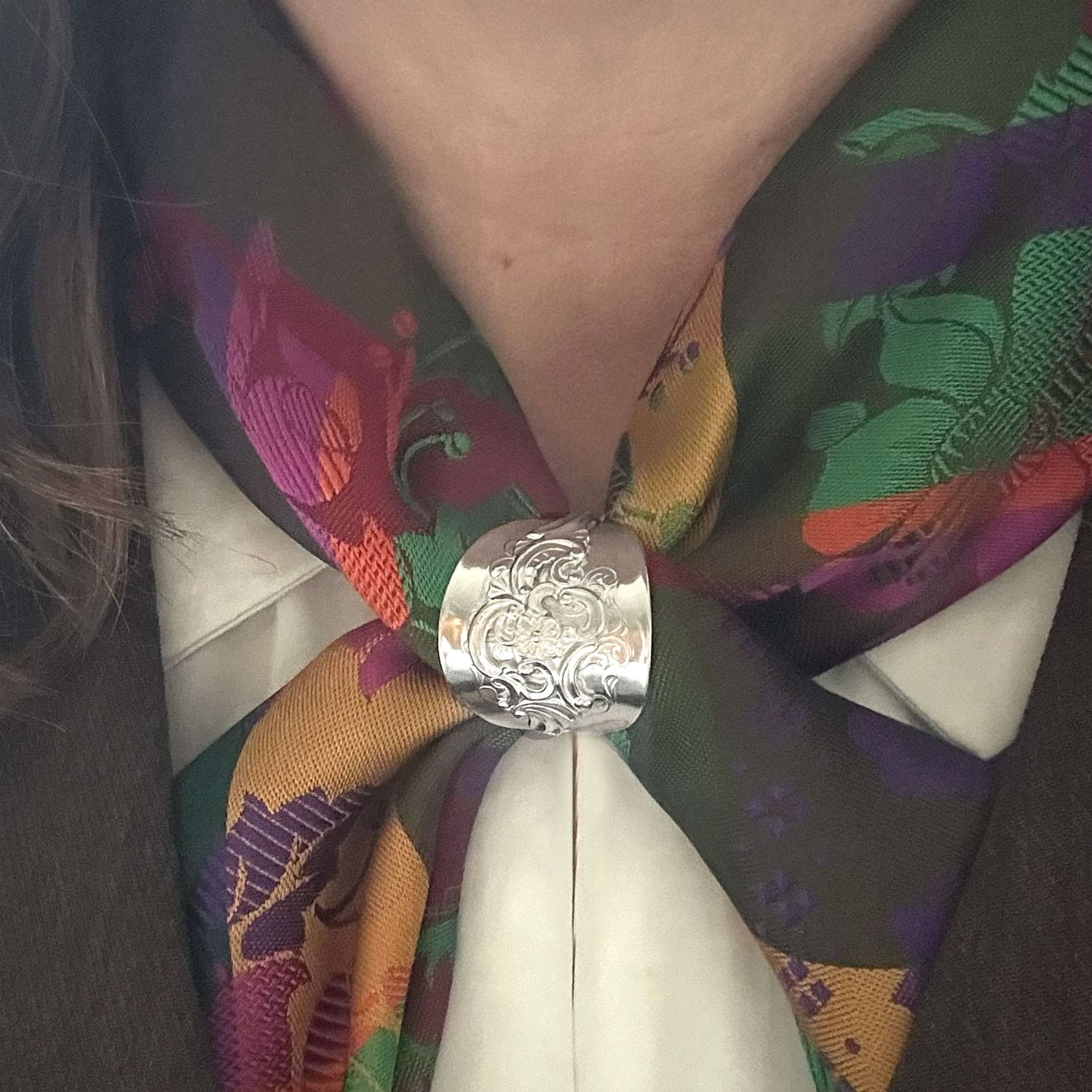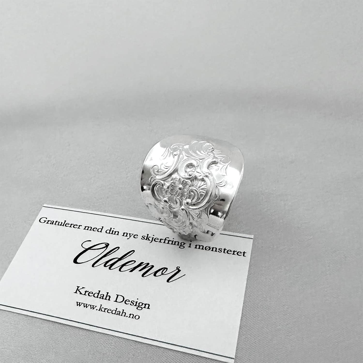 Skjerfring Oldemor er laget av sølvbestikk i dette tradisjonelle mønsteret, formet for bruk til bunad.