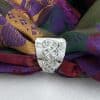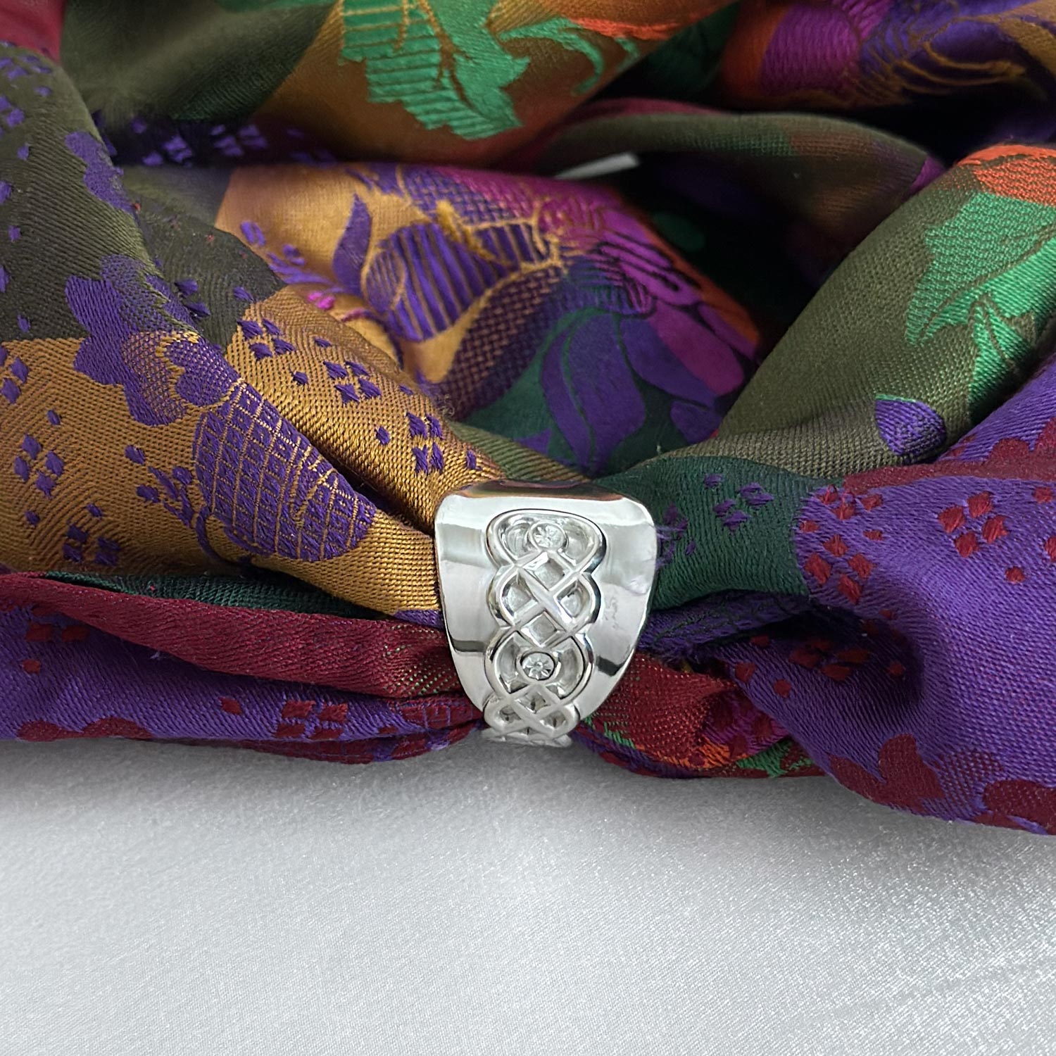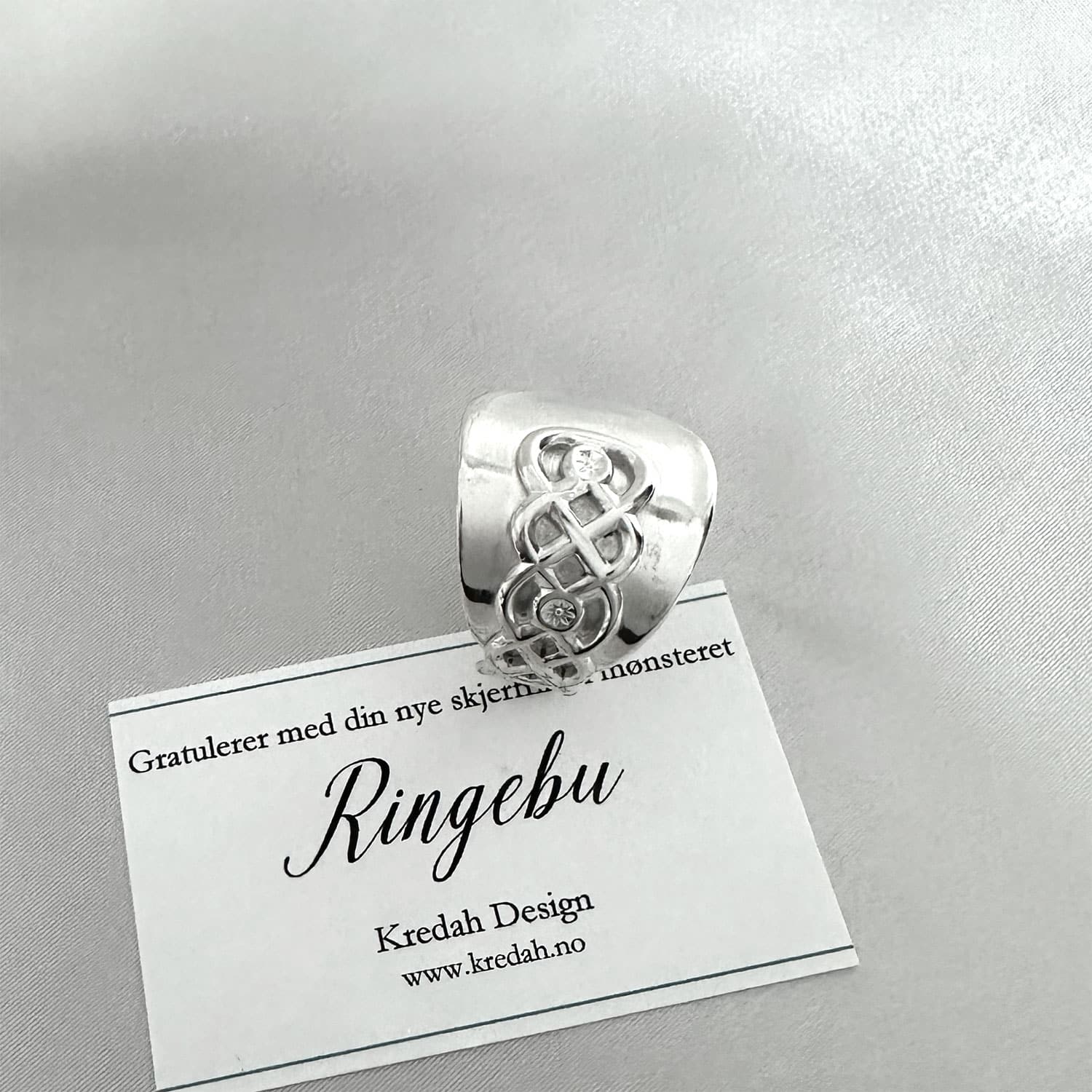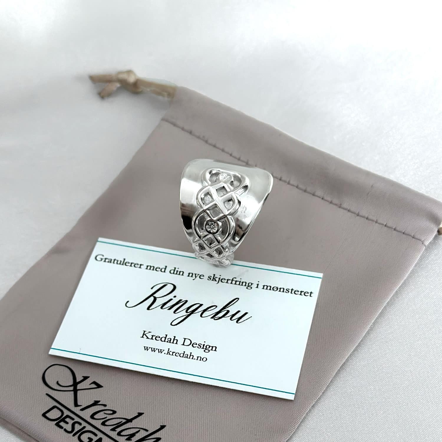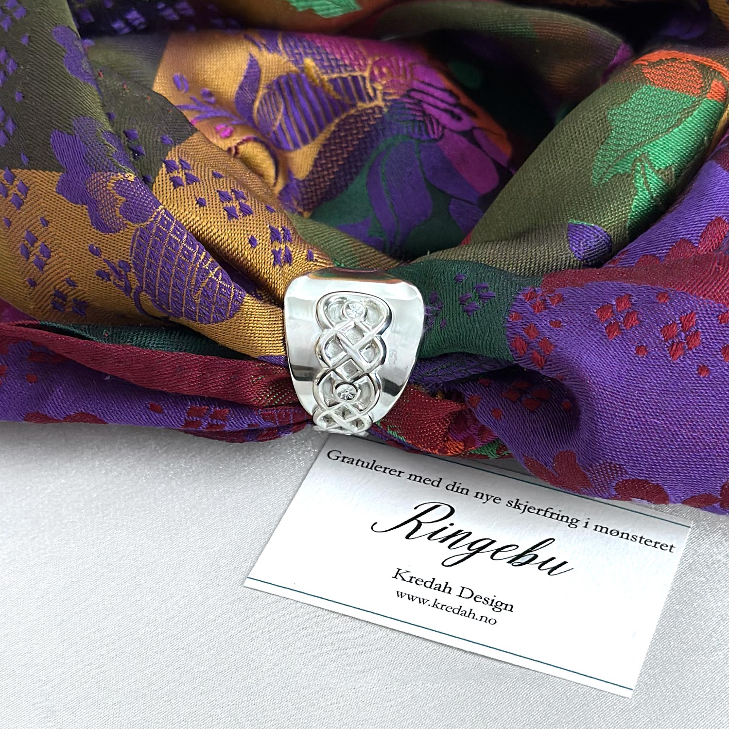 Skjerfringen passer til silkeskjerf til bunad, men også til andre tynne skjerf. Den kan brukes både til hverdag og fest, og gir et rolig og gjennomført uttrykk. Denne ringen har levd et liv før den ble formet på nytt. Bestikket er bearbeidet for hånd og gitt en ny funksjon. Den bærer med seg et streif av nostalgi, minner om generasjoner før oss og gir silkeskjerfet et vakkert feste uten nåler som lager hull i stoffet.