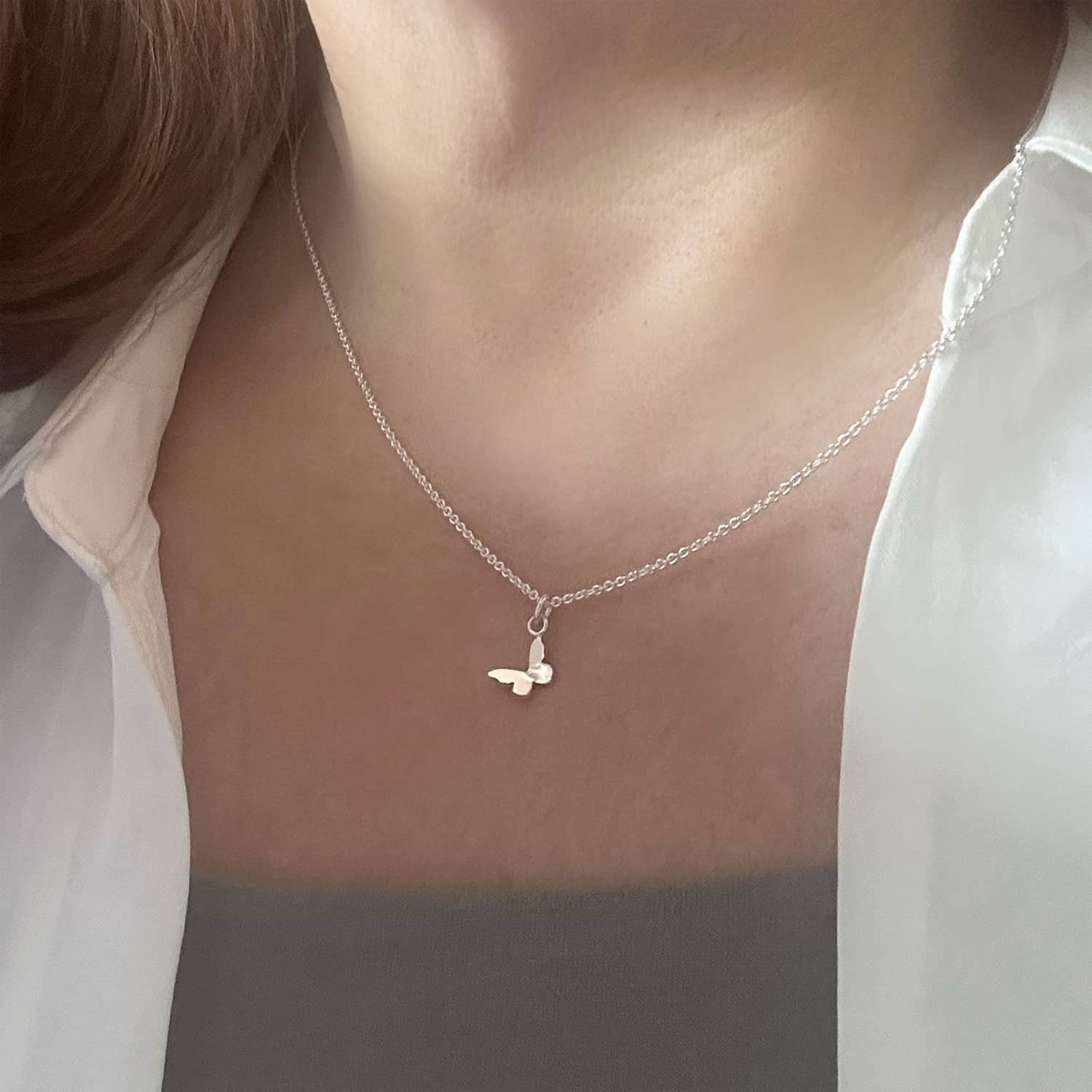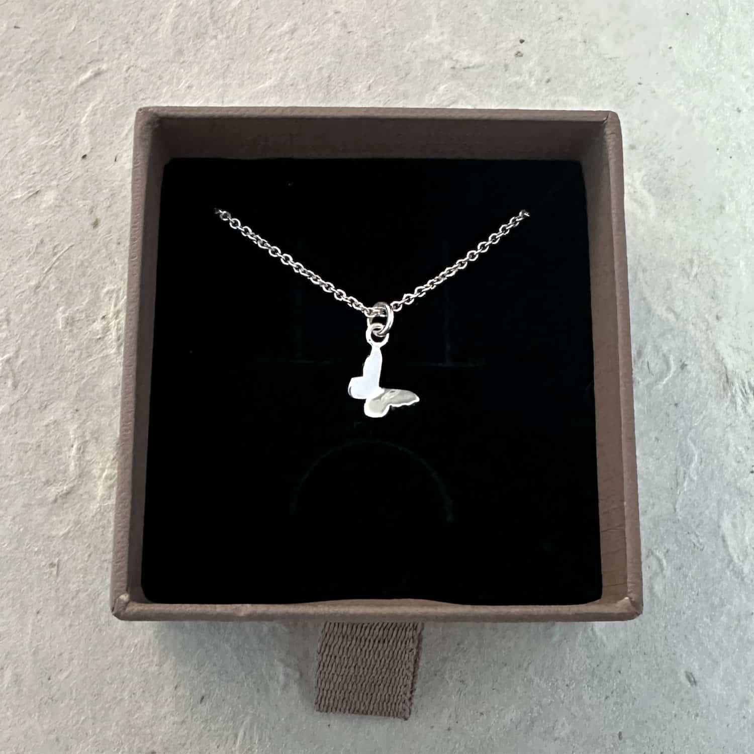Et lite sommerfugl halssmykke håndlaget i sølv, med myke, organiske linjer.