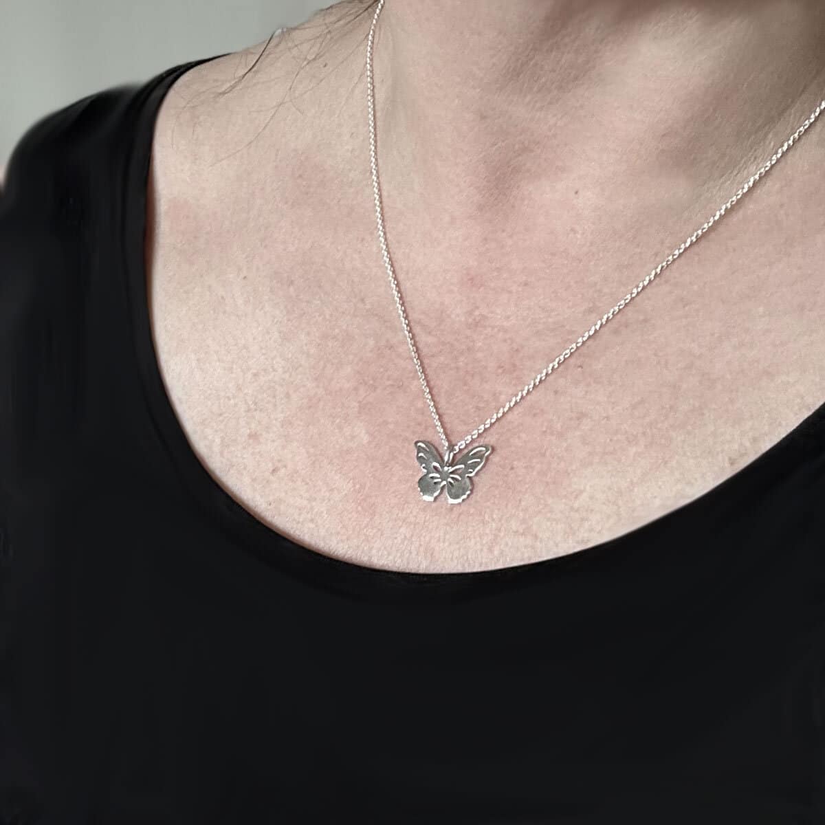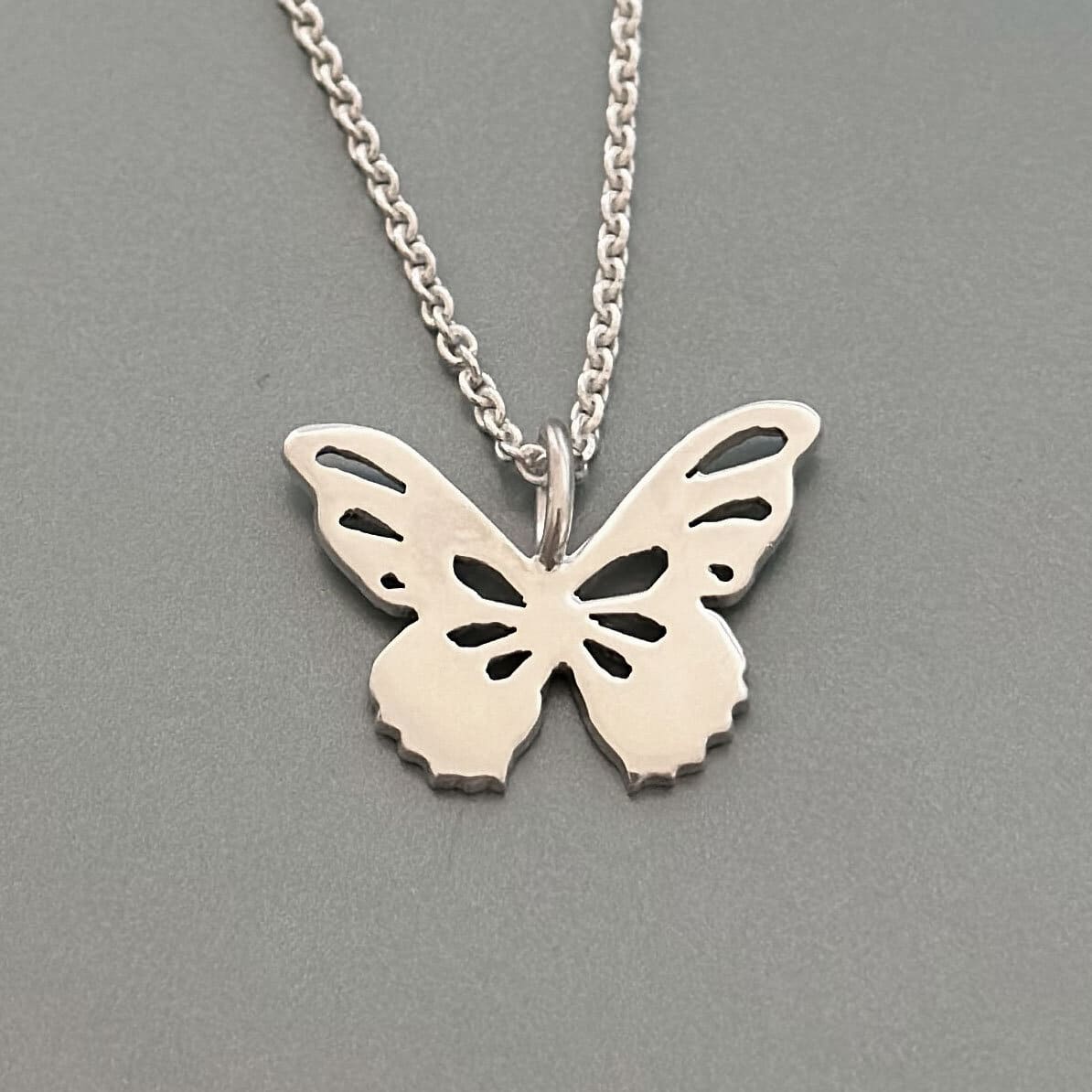 Stor sommerfugl halssmykke håndlaget i sølv, formet med myke, organiske linjer.