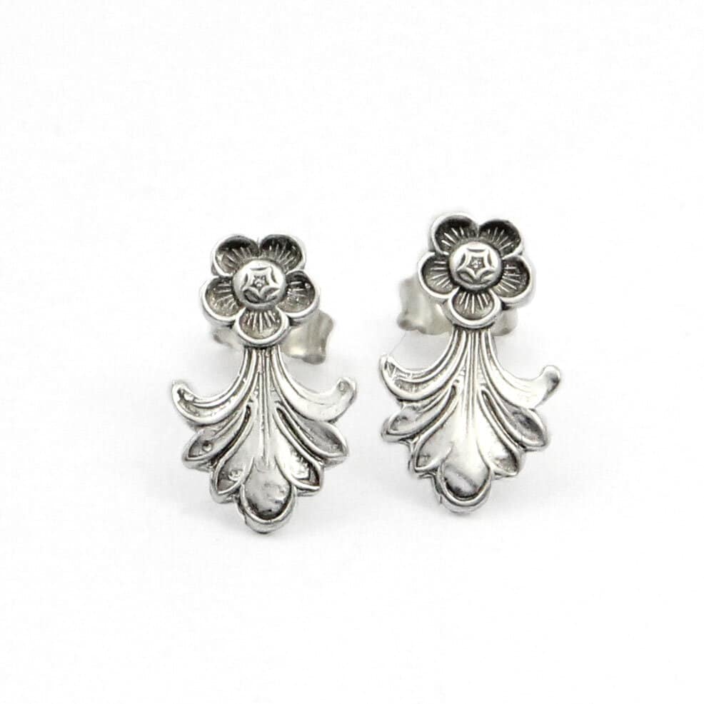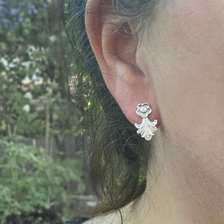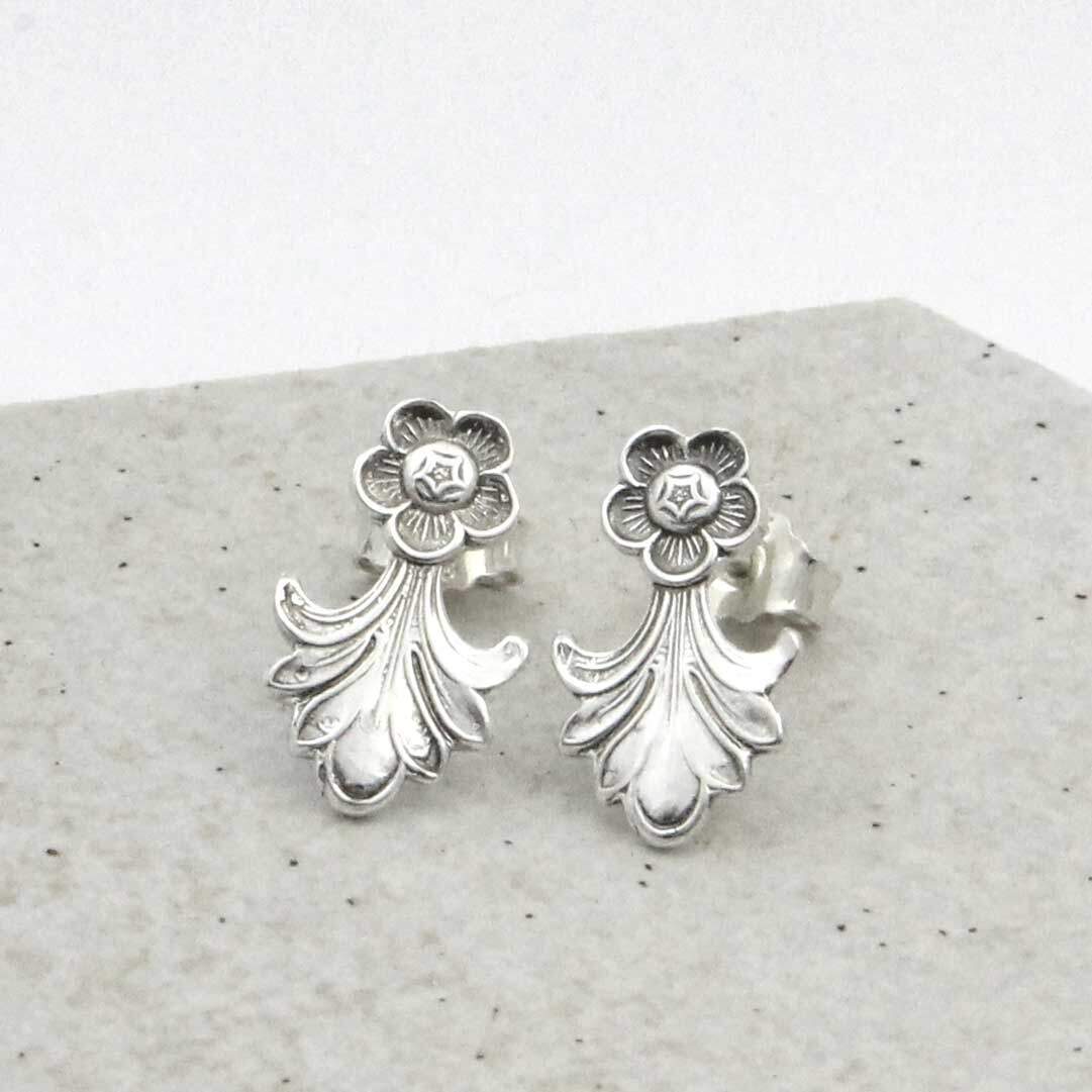 Viking Rose ørepynt er redesignet av en sølvskje med det klassiske mønsteret Viking Rose. Formen minner om små blomster og gir smykket et tidløst og rolig uttrykk.